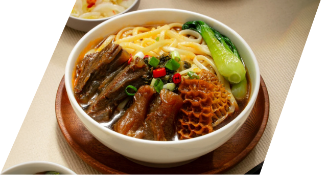 Evergreen Sky Catering meticulously selects and braises beef shank, tendon, and tripe, serving it with chewy noodles in a spicy soup to create a comforting inflight experience.
